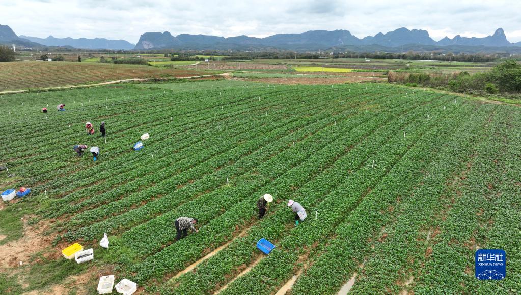 3月27日,在柳州市柳城縣社沖鄉柳州螺螄粉原材料基地里,農民在蔬菜基地里采摘蔬菜(無人機照片)。