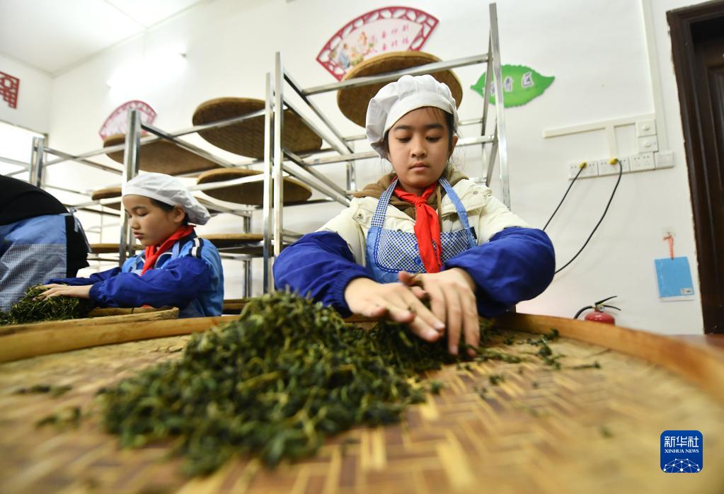 3月29日,在廣西梧州市蒼梧縣六堡鎮中心校,小學生們在學習制茶。