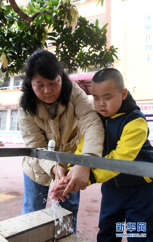 在廣西南寧高新區龍華學校,何冬艷教孤獨癥學生洗手(3月31日攝)。