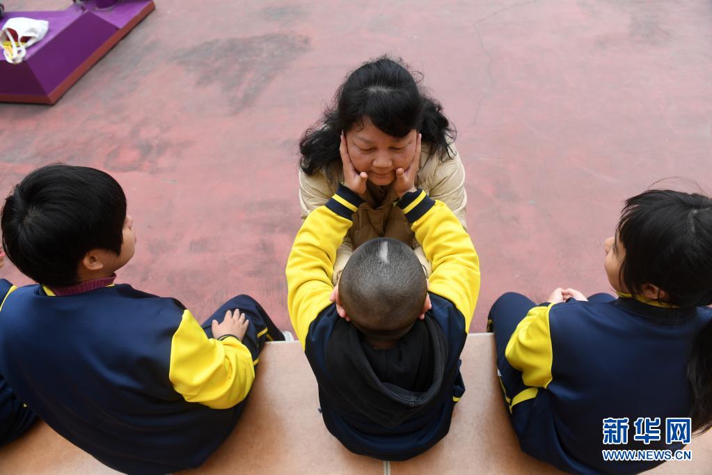 在廣西南寧高新區龍華學校,何冬艷和孤獨癥學生在一起(3月31日攝)。