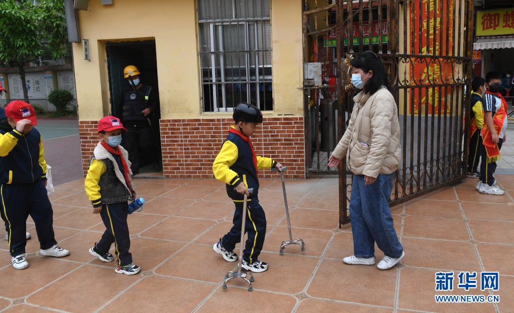 在廣西南寧高新區龍華學校,何冬艷放午學后領著她照顧的學生準備走出校園(3月31日攝)。