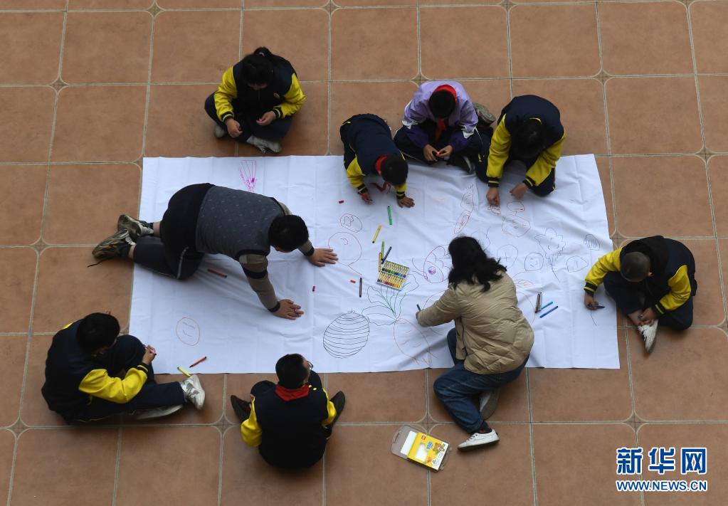 在廣西南寧高新區龍華學校,何冬艷教學生畫畫(3月31日攝)。