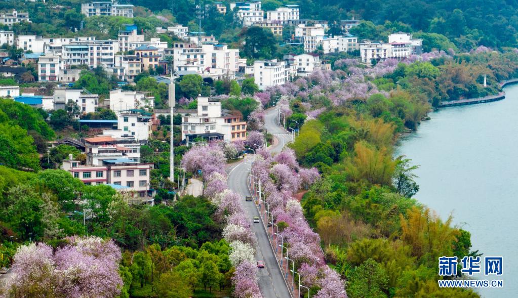 廣西柳州市環江濱水大道洋紫荊盛開(4月5日攝,無人機照片)。