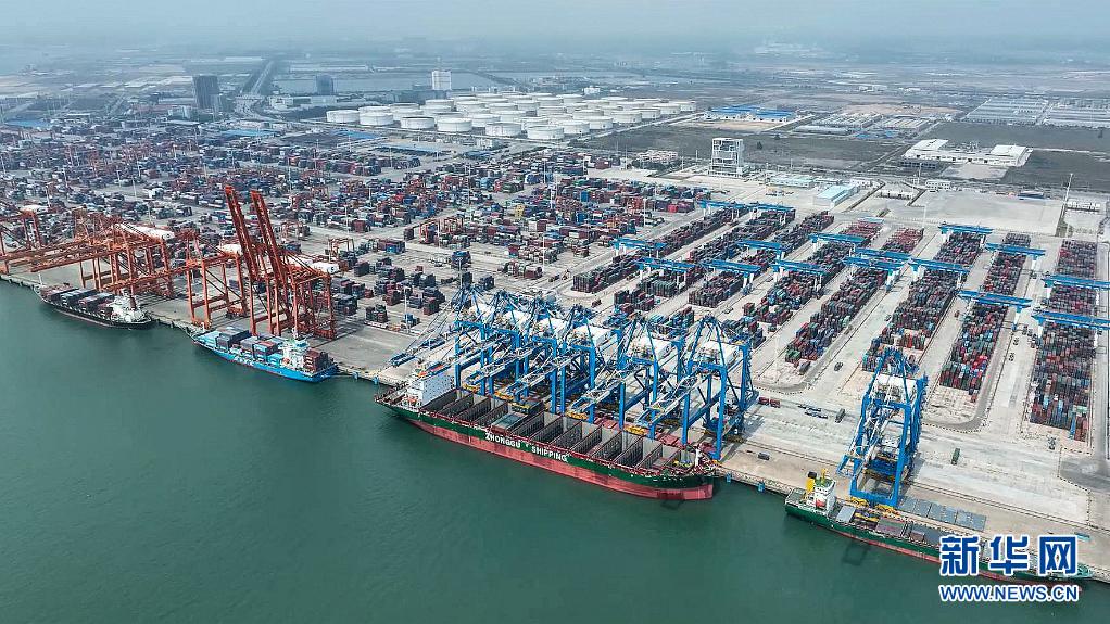 海輪在欽州港碼頭裝運集裝箱(4月4日攝)。