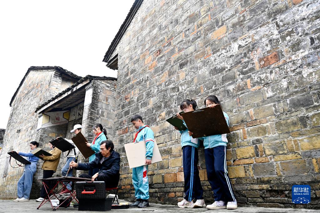 4月10日,在柳城縣古砦仫佬族鄉大戶村灘頭屯,幾名學生跟隨老師在民居旁寫生。