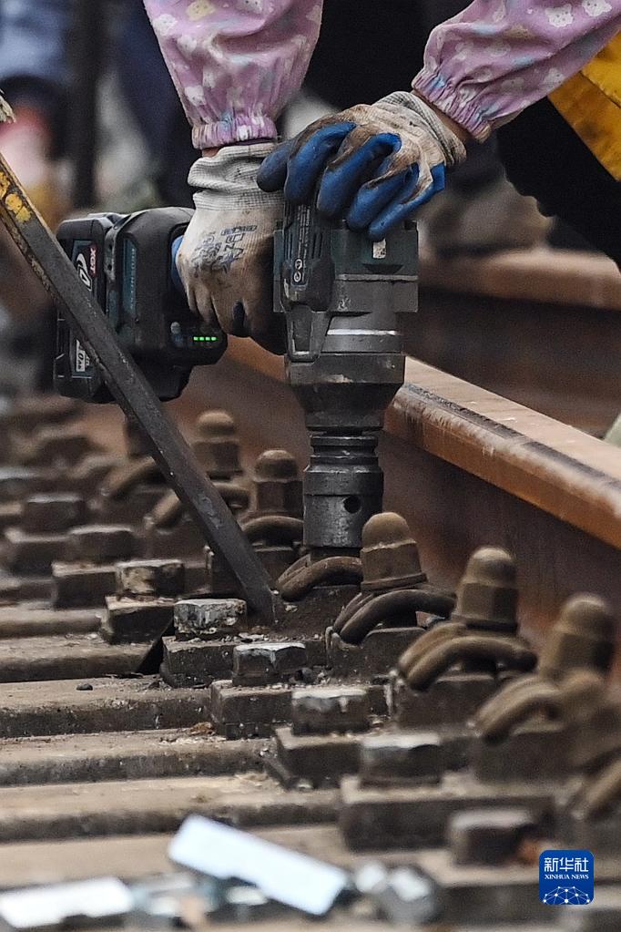 4月12日,在廣西欽州港站,一名工人在緊固新鐵軌螺絲。