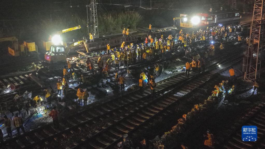 4月12日,廣西欽州港站的工人在夜間更換鐵軌(無人機照片)。