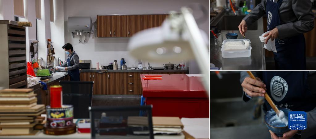 拼版照片:4月14日,在廣西壯族自治區圖書館古籍保護中心的工作室內,黃玉杏在修補工作開始前調制漿糊。