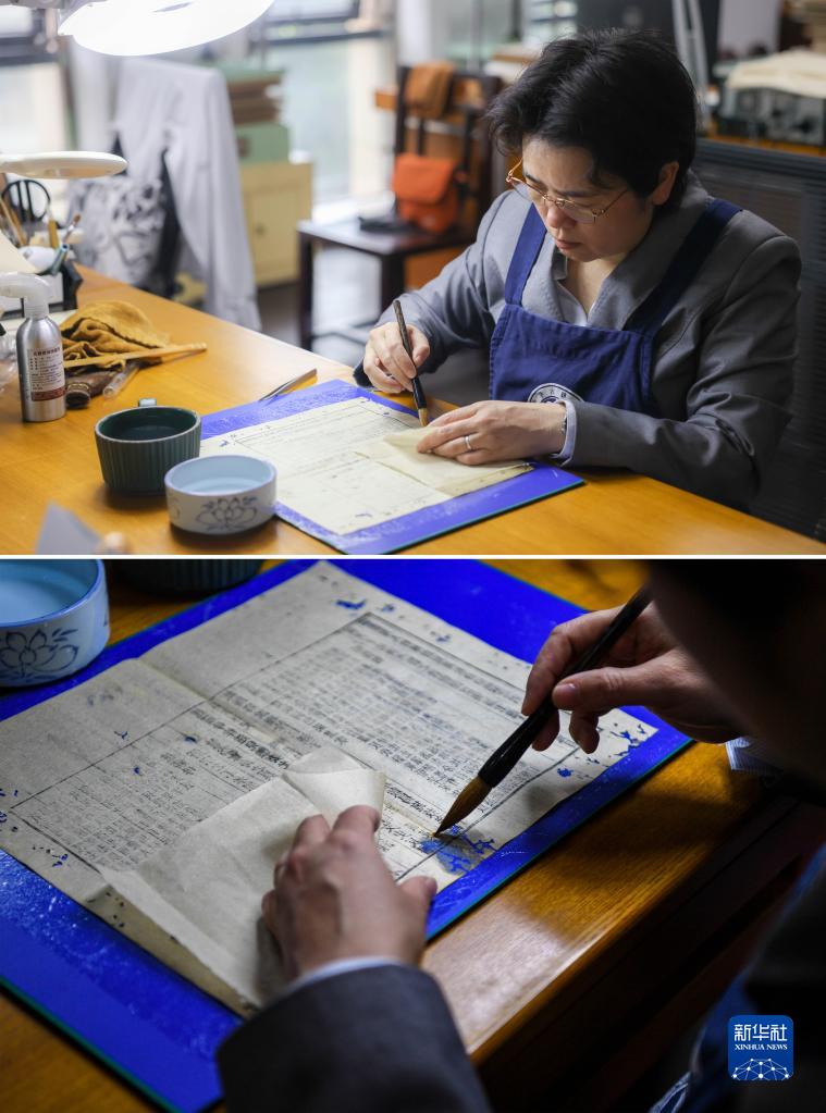 拼版照片:4月14日,在廣西壯族自治區圖書館古籍保護中心的工作室內,黃玉杏在修補古籍(上圖由新華社記者胡星宇攝;下圖由新華社記者曹祎銘攝)。