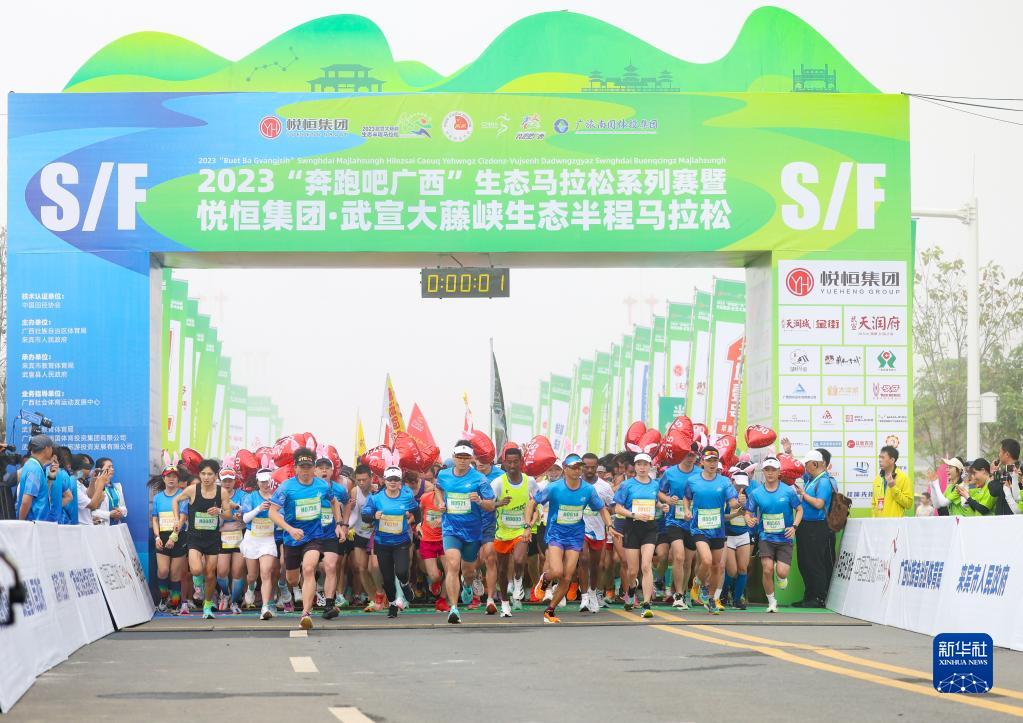當日,2023“奔跑吧廣西”生態馬拉松系列賽暨武宣大藤峽生態半程馬拉松在廣西來賓市武宣縣開跑。