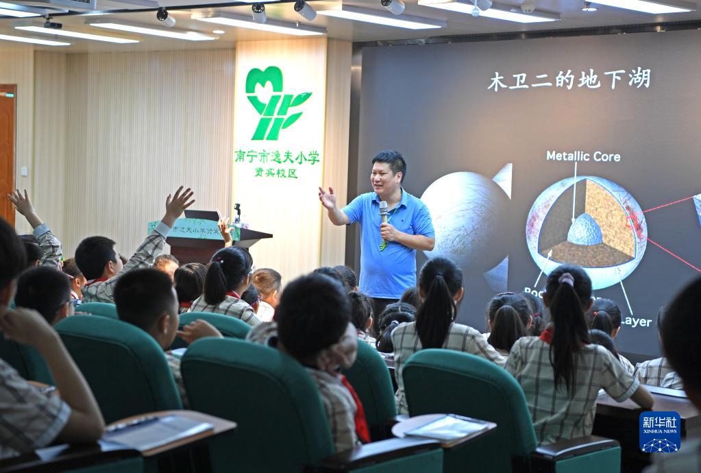 當日,廣西南寧市逸夫小學賢賓校區舉行科學家進校園活動。孩子們在中國科學院國家空間科學中心研究員、中國航天科普大使劉勇的帶領下,了解天體系統知識,播種下空間科學的夢想。