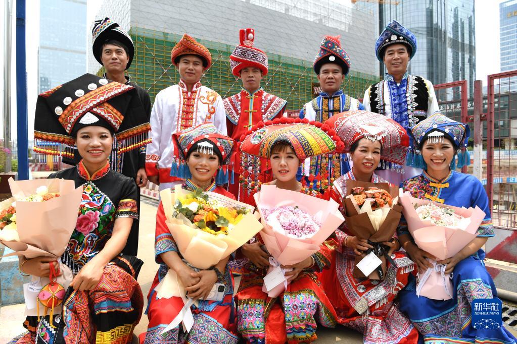 身著民族服裝的建筑工在廣西南寧市良慶區五象大道中建三局一公司南寧中銀金融中心項目建設工地留影(4月19日攝)。