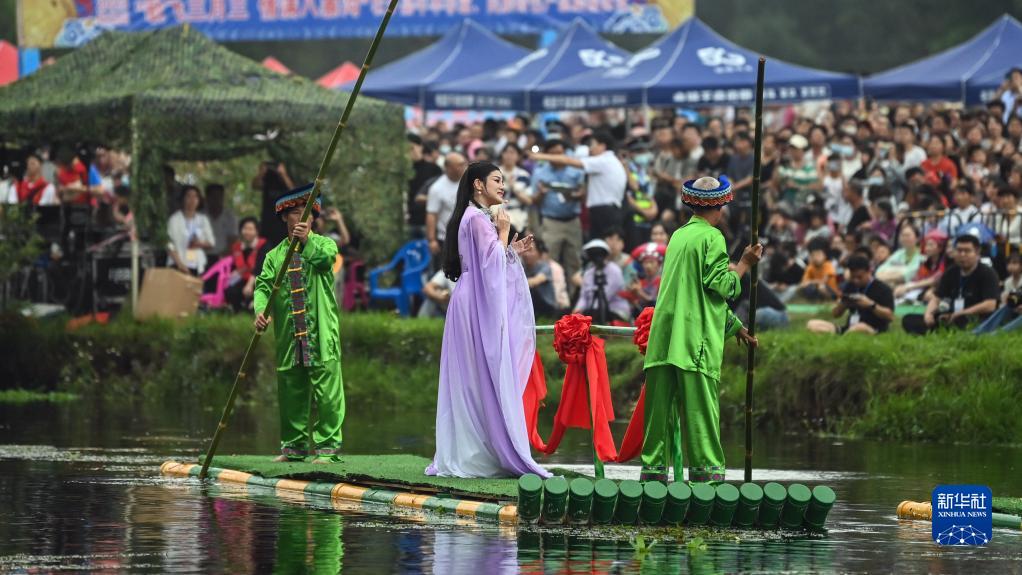 當日,廣西欽州市在欽北區貴臺鎮洞利江畔舉行實景演出,歡慶“三月三”傳統佳節。