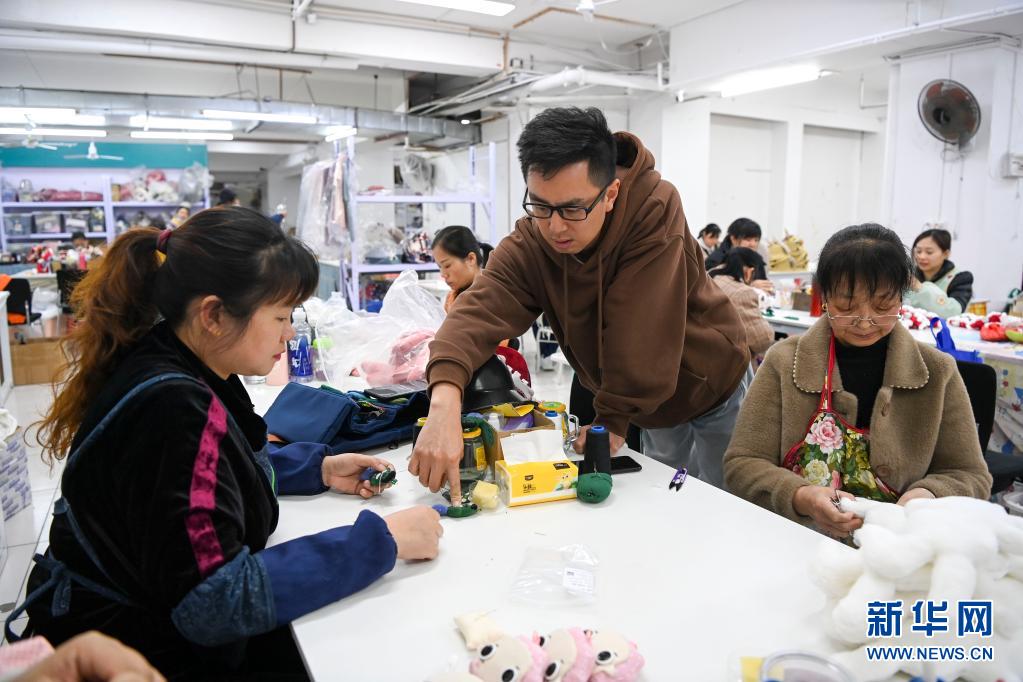 4月26日,蒙揚文(中)在廣西桂林市龍勝各族自治縣的一處生產車間給繡娘指導縫制技術。