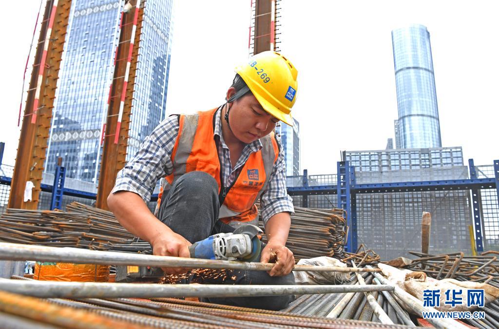 4月29日,工人在廣西南寧市良慶區中建三局一公司南寧中銀金融中心項目建設工地切割鋼管。