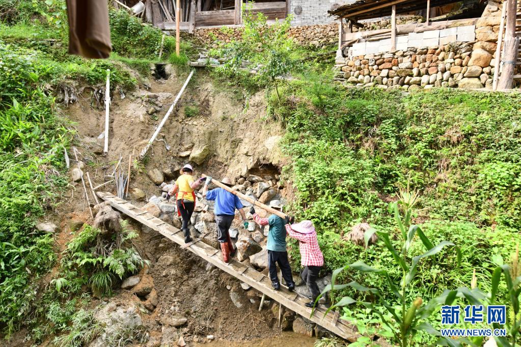 廣西融水苗族自治縣桿洞鄉烏英苗寨群眾在維修被水沖毀的路基(2022年7月21日攝)。