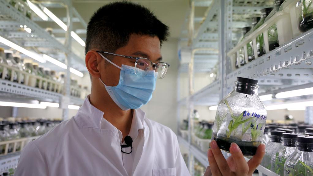張金顯展示實驗室里的蘭花種苗。新華社記者 梁舜 攝