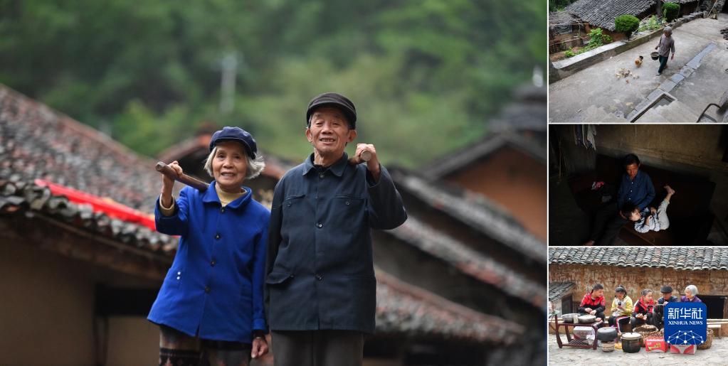 拼版照片:左圖為廣西融安縣東起鄉銅板屯85歲的老人龍顯星(右)和老伴巫福昭(2023年4月24日攝);右上圖為巫福昭在喂雞(2013年7月23日攝);右中圖為龍顯星和外孫女在一起(2013年7月24日攝);右下圖為龍顯星(右二)、巫福昭帶著已經長大了的孫悲們賣土特產(2021年2月15日攝)。