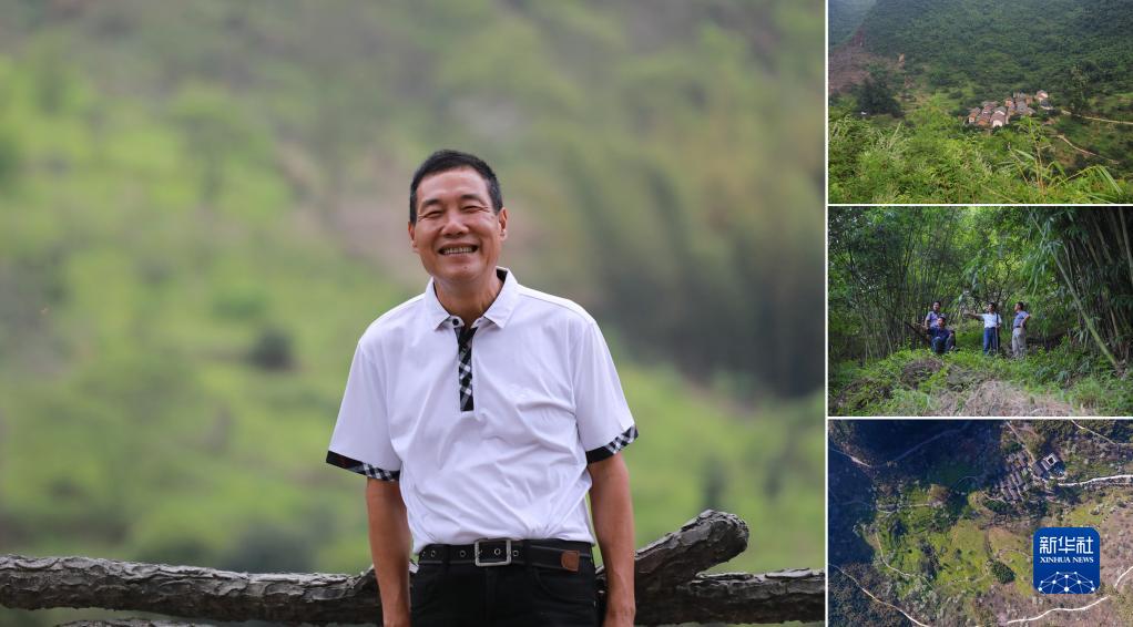 拼版照片:左圖為廣西融安縣東起鄉銅板屯60歲的村民龍飛任(2022年3月20日攝);右上圖為2012年10月21日拍攝的銅板屯;右中圖為龍飛任(左一)和村民們在山上規劃銅板屯的發展(2013年6月19日攝);右下圖為2019年3月3日無人機拍攝的銅板屯。