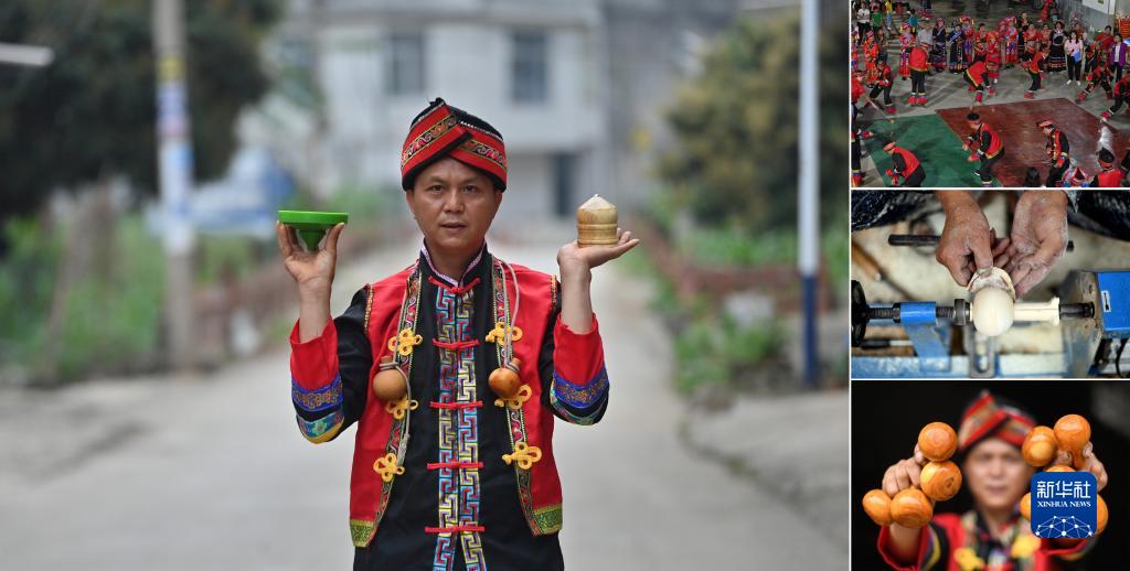 拼版照片:左圖為廣西大化瑤族自治縣大化鎮仁良村44歲的村民韋壽基在展示陀螺(2023年4月22日攝);右上圖為韋壽基和村民們在陀螺比賽中(2023年4月22日攝);右中圖為韋壽基在制作陀螺(2023年4月29日攝);右下圖為韋壽基展示剛剛做好的陀螺(2023年4月22日攝)。