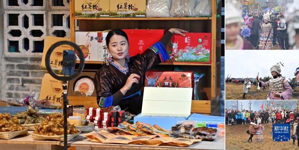 拼版照片:左圖為“90后”苗族姑娘賈宥凌在廣西融水苗族自治縣夢嗚苗寨的工作室直播帶貨(2023年4月24日攝);右上、中、下圖為賈宥凌在坡會上做直播(2023年2月6日攝)。