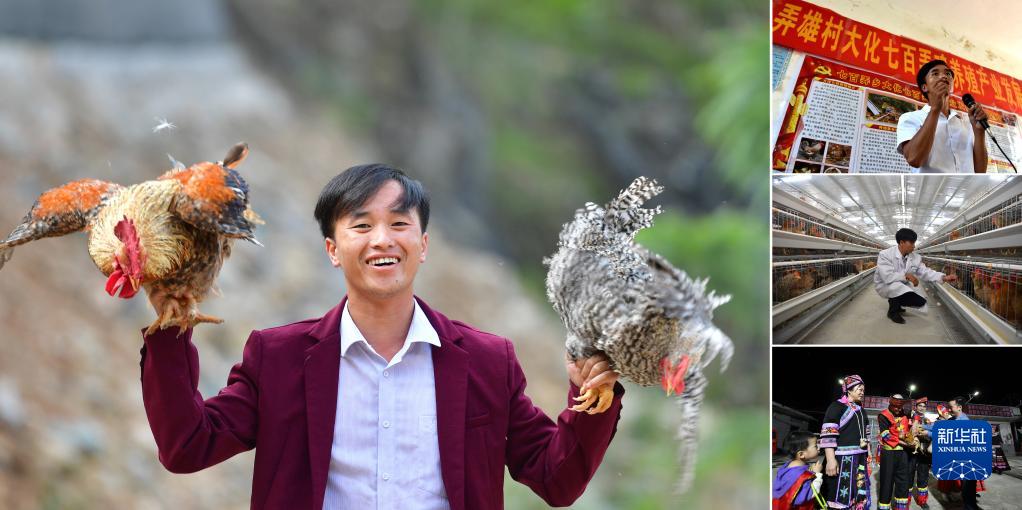 拼版照片:左圖為在廣西大化瑤族自治縣七百弄鄉弄雄村,藍志平展示七百弄雞(2019年11月10日攝);右上圖為在弄雄村七百弄雞養殖產業發展動員會上,藍志平動員群眾發展土雞養殖(2016年8月17日攝);右中圖為在弄雄村七百弄雞養殖場,藍志平在查看種雞的生長情況(2019年11月10日攝);右下圖為在大化瑤族自治縣大化鎮仁良村,藍志平(右)捐贈七百弄雞(2023年4月15日攝)。