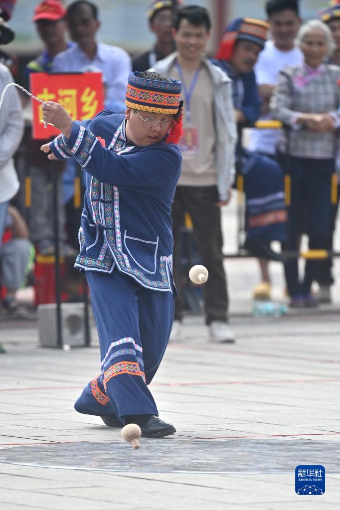 當日,廣西河池市大化瑤族自治縣舉辦“快樂五一”陀螺團體比賽,全縣16個鄉鎮代表隊的64名選手參賽。