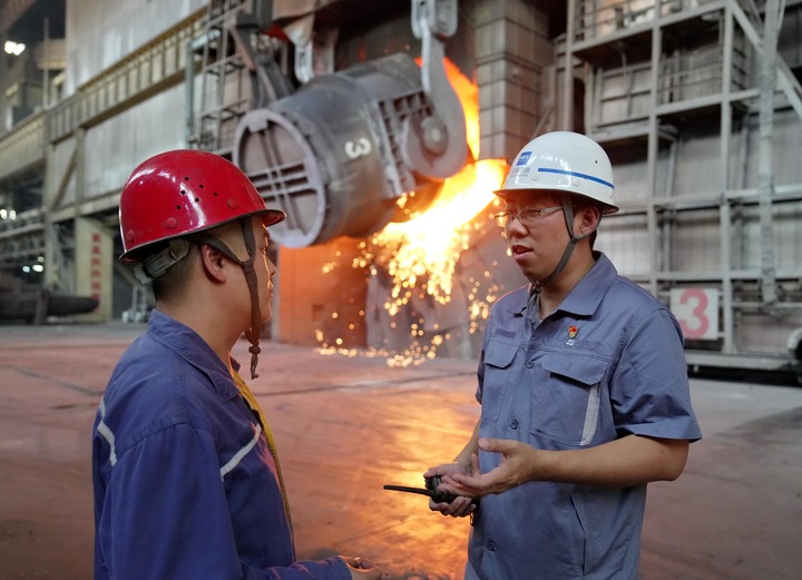 2022年9月7日,唐笑宇(右)在轉爐車間與工友交流。新華社記者楊世堯 攝