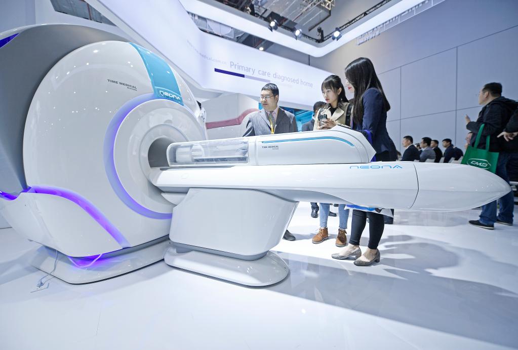 2019年11月7日,在第二屆進博會醫療器械及醫藥保健展區,工作人員為參觀者介紹兒科專用核磁共振成像系統。新華社記者王鵬 攝