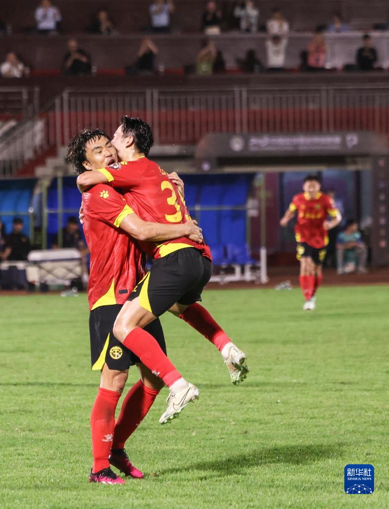 5月10日,廣西平果哈嘹隊球員趙旭日(左)進球后與隊友劉柏楊慶祝。
