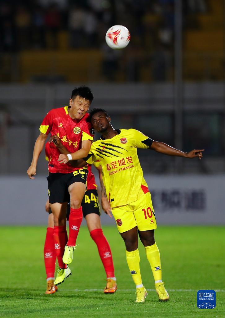5月10日,廣西平果哈嘹隊球員鄒正(左)與上海嘉定匯龍隊球員埃迪在比賽中爭頂。