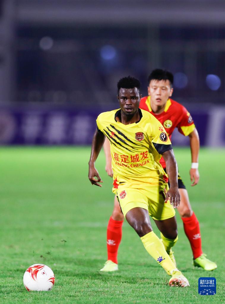 5月10日,上海嘉定匯龍隊球員埃迪(前)與廣西平果哈嘹隊球員鄒正在比賽中拼搶。
