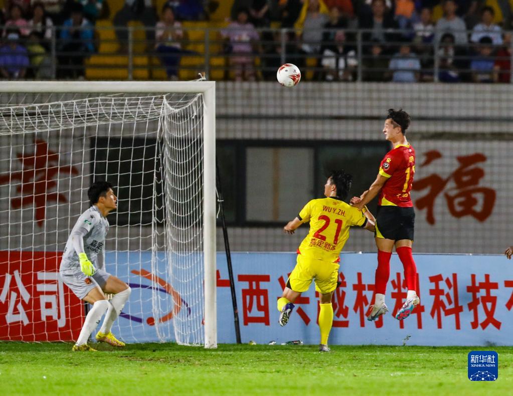 5月10日,廣西平果哈嘹隊球員安永佳(右)在比賽中頭球破門。
