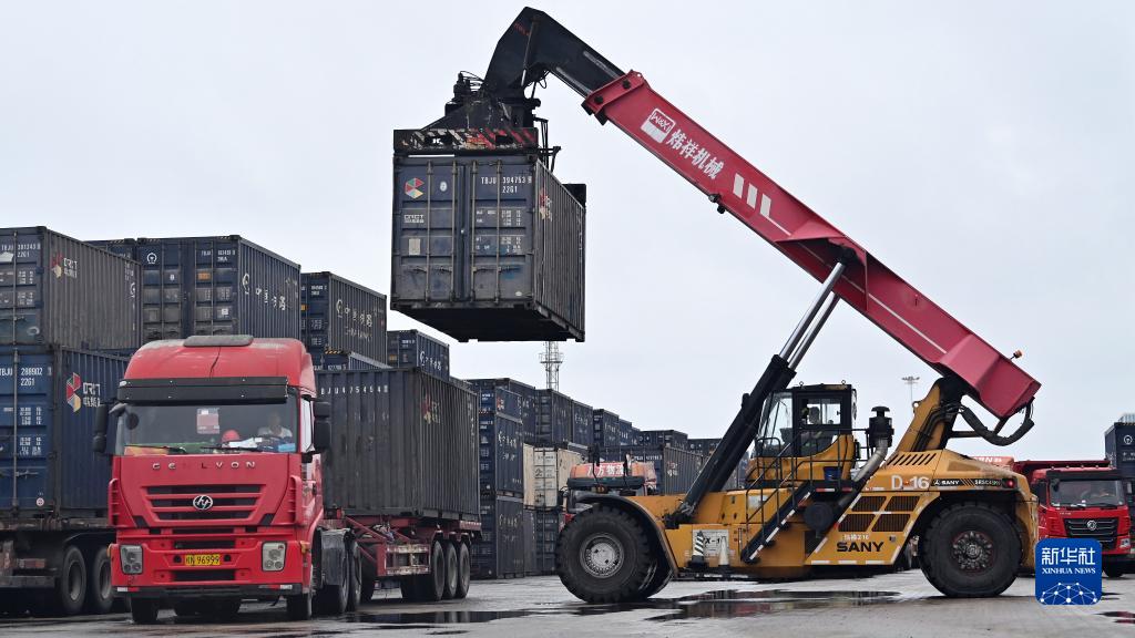 在廣西欽州鐵路集裝箱中心站,吊車給汽車裝運集裝箱(5月11日攝)。