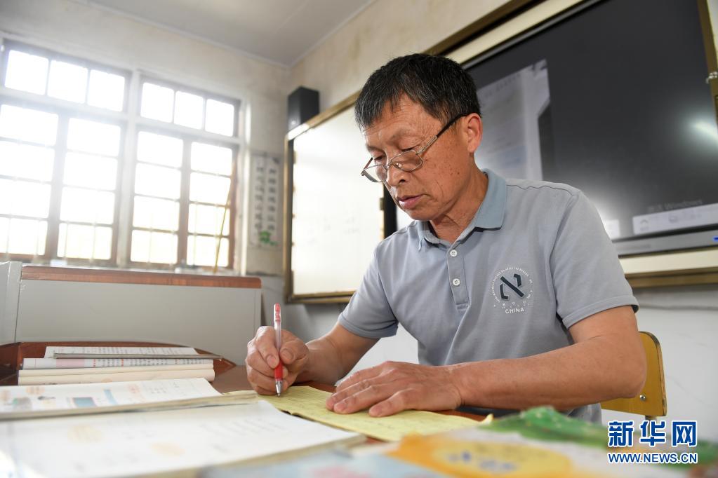 5月18日,在廣西靈川縣蘭田瑤族鄉深潭教學點,趙洪老師在批改作業。
