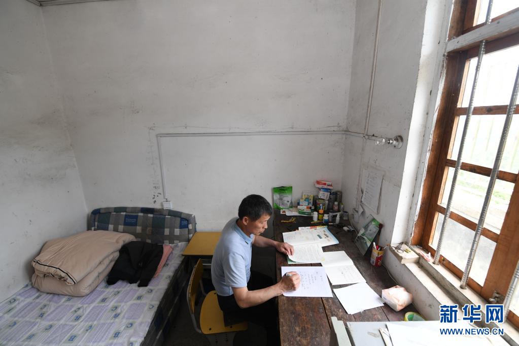 5月18日,在廣西靈川縣蘭田瑤族鄉深潭教學點,趙洪老師在學校辦公室兼臥室里備課。