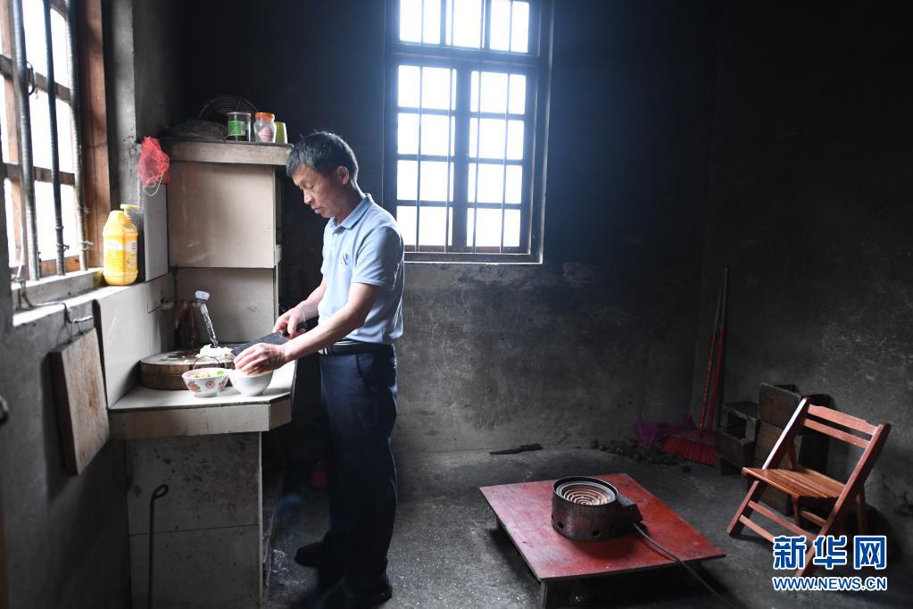 5月18日,在廣西靈川縣蘭田瑤族鄉深潭教學點,趙洪老師在學校食堂里做自己的午飯。