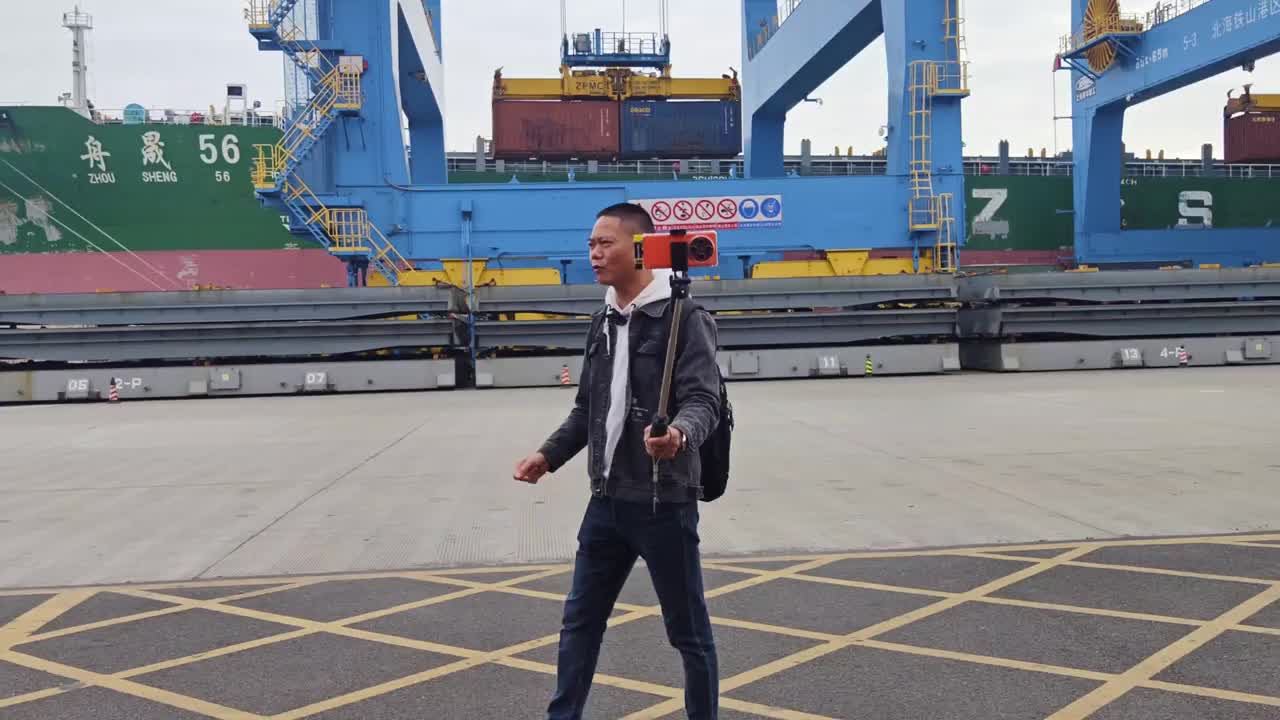網絡名人“老梁說事”在北部灣港北海碼頭拍攝視頻。