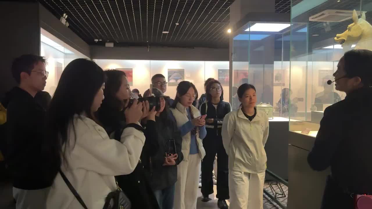 合浦漢代文化博物館講解員為網絡名人講解2003年出土的西漢銅馬。