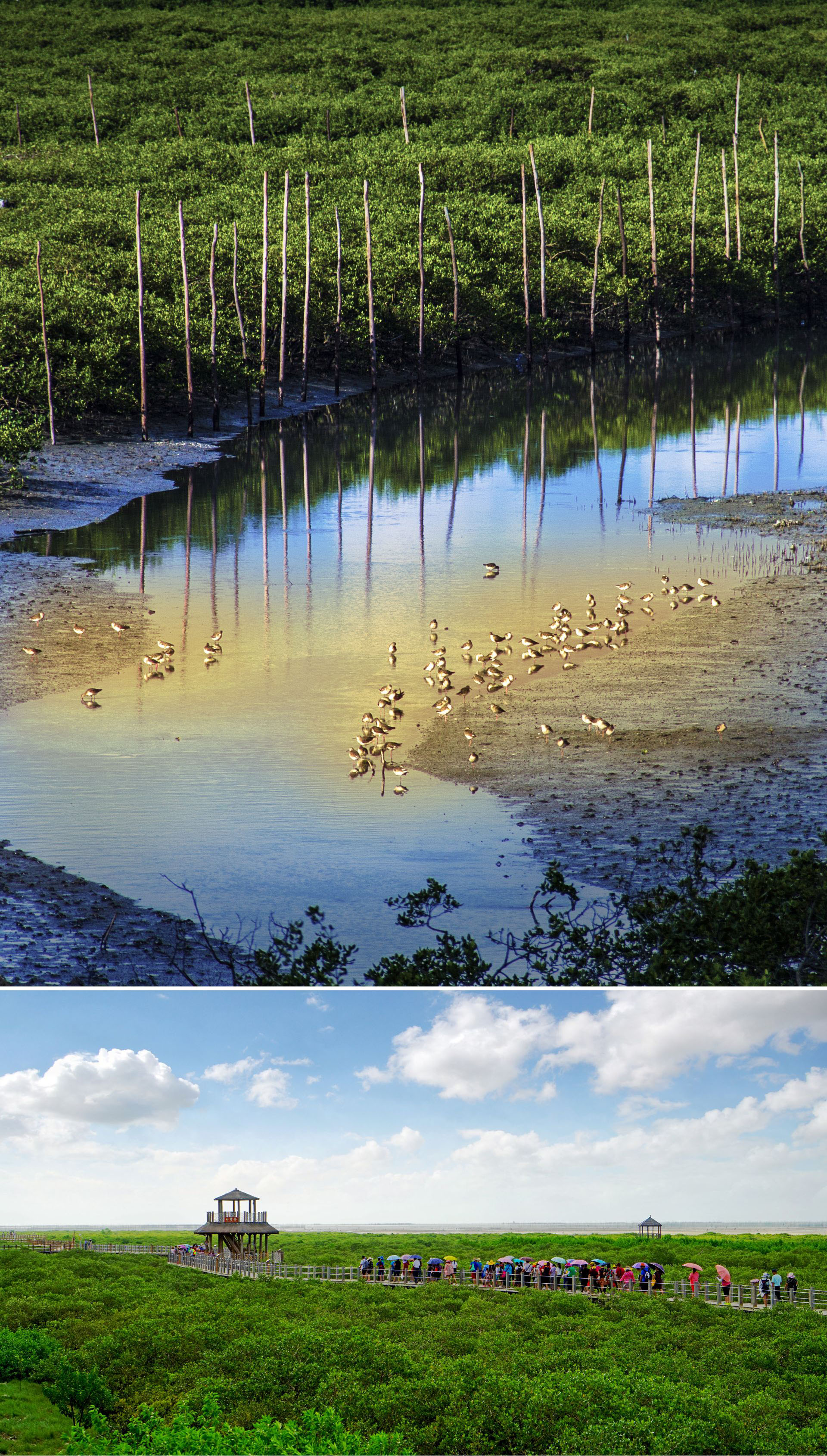 北海金海灣紅樹林生態旅游區生長著一片3000多畝的“海上森林”——紅樹林,紅樹林是熱帶、亞熱帶海岸潮間帶特有的胎生木本植物群落,能抗風抵浪,素有“海上森林”“海岸衛士”之稱,是國家級重點保護的珍稀植物。景區內的紅樹林連片寬闊,高低錯落,盤根錯節,千姿百態,枝繁葉茂,碧綠滴翠,為林內和附近的海洋生物提供了理想的繁衍棲息場所,構成了濱海濕地豐富的生物鏈,保持著北海濱海濕地的生態平衡,潮漲潮落,風景迷人。