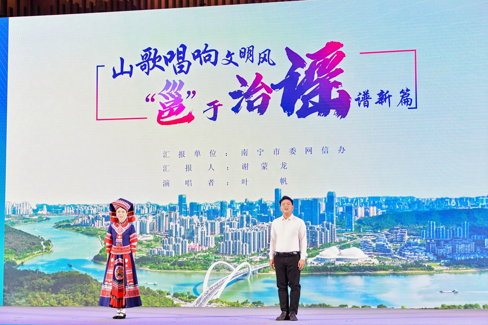 現場展示南寧市辟謠山歌《辟謠嘹嘹啰》。該作品將網絡辟謠唱進嘹啰山歌,借助山歌這張閃亮的文化名片,唱響網絡辟謠最強音。
